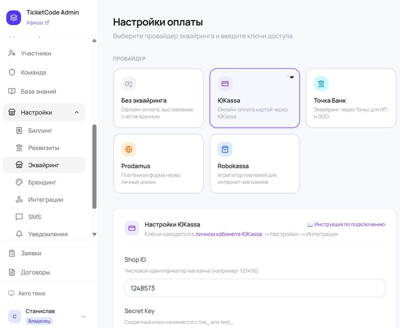 Разработали ticketcode.ru с нуля: онлайн-оплата (карта, СБП), автогенерация счетов и актов для юрлиц, автораспознавание банковских платежей (Точка, Альфа, Тинькофф), глубокая интеграция с amoCRM и Битрикс24, PDF-билеты с QR-кодом, интерактивная схема зала на 200+ мест, кабинет организатора с аналитикой.