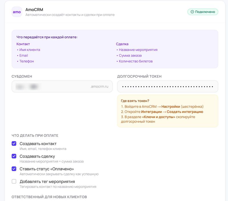 Глубокая интеграция с CRM. Заказчик работает в amoCRM. Нужно, чтобы при каждой покупке автоматически создавалась сделка с заполнением кастомных полей: мероприятие, пакет, способ оплаты, спикер, город, ID заказа.