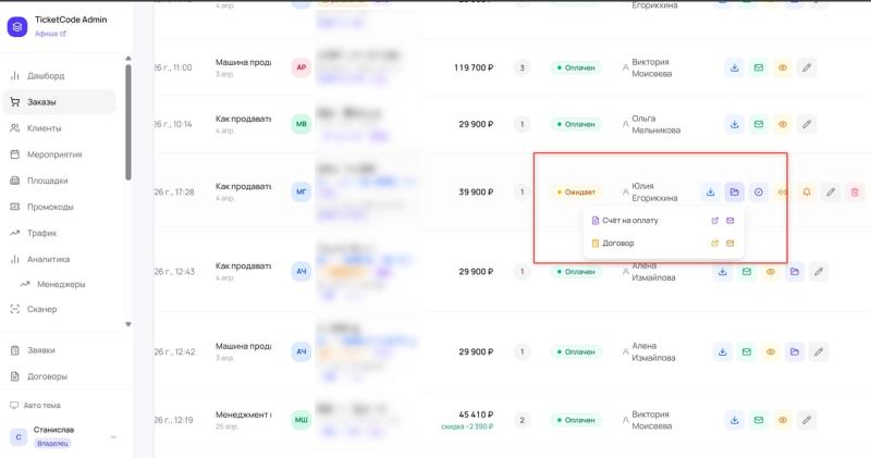 Список заказов с фильтрами по статусу, дате, типу оплаты, мероприятию. Поиск работает с кириллицей в любом регистре. Звучит очевидно, но это одна из тех мелочей, которые экономят минуты каждый день.