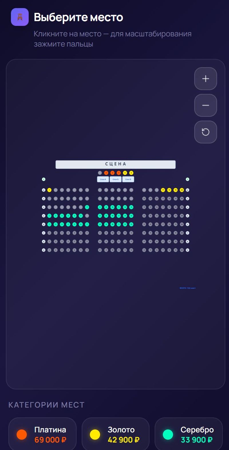 Для мероприятий с фиксированной рассадкой мы разработали интерактивную SVG-схему зала. Покупатель видит карту зала, кликает на конкретное кресло и сразу понимает, где будет сидеть. Схема поддерживает более 200 мест и обновляется в реальном времени — занятые места блокируются сразу после оплаты.